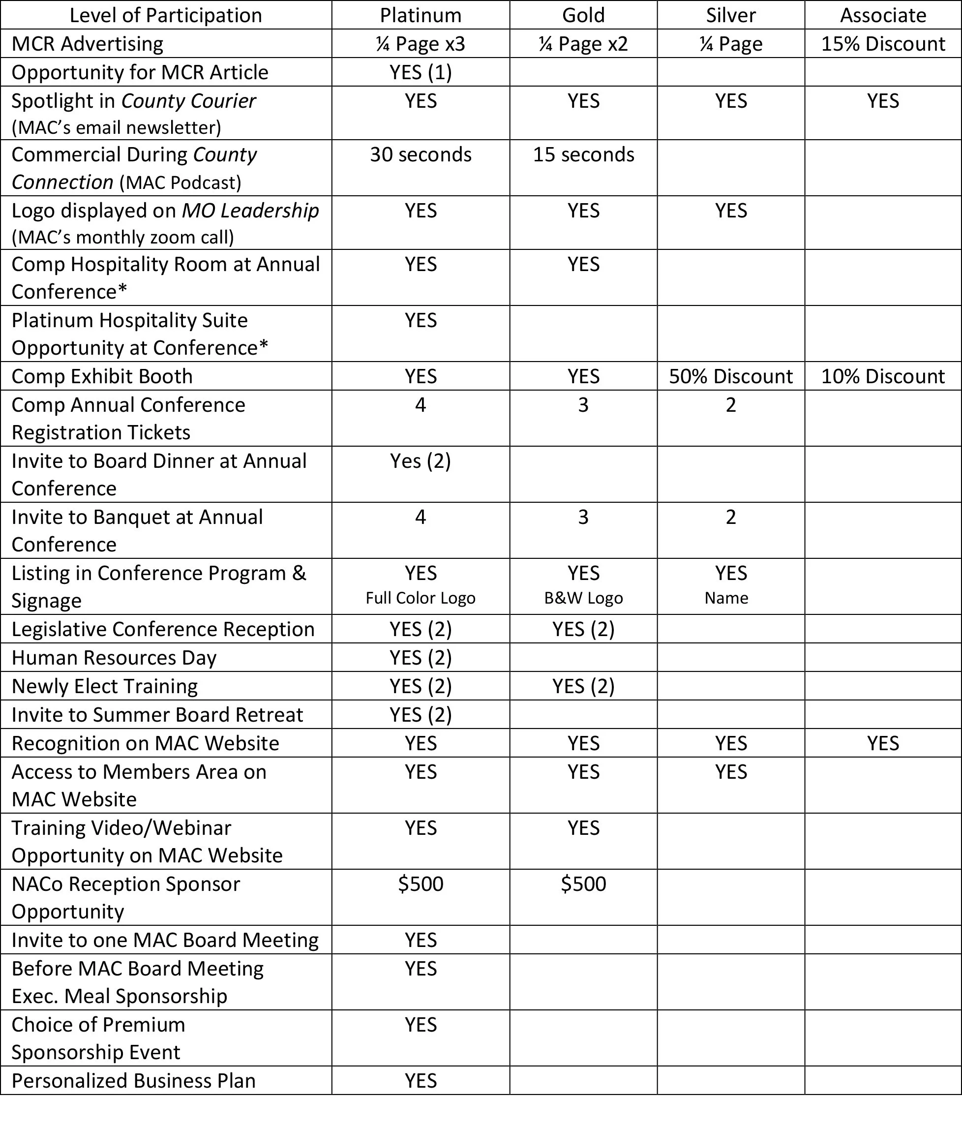 Companies and organizations that work with county government on issues that focus on public policy, transportation, technology, legal, criminal justice, finance, land use, consulting, and business and leadership development will see added value in becoming annual partners in the program, as they build their relationships with the members of MAC.